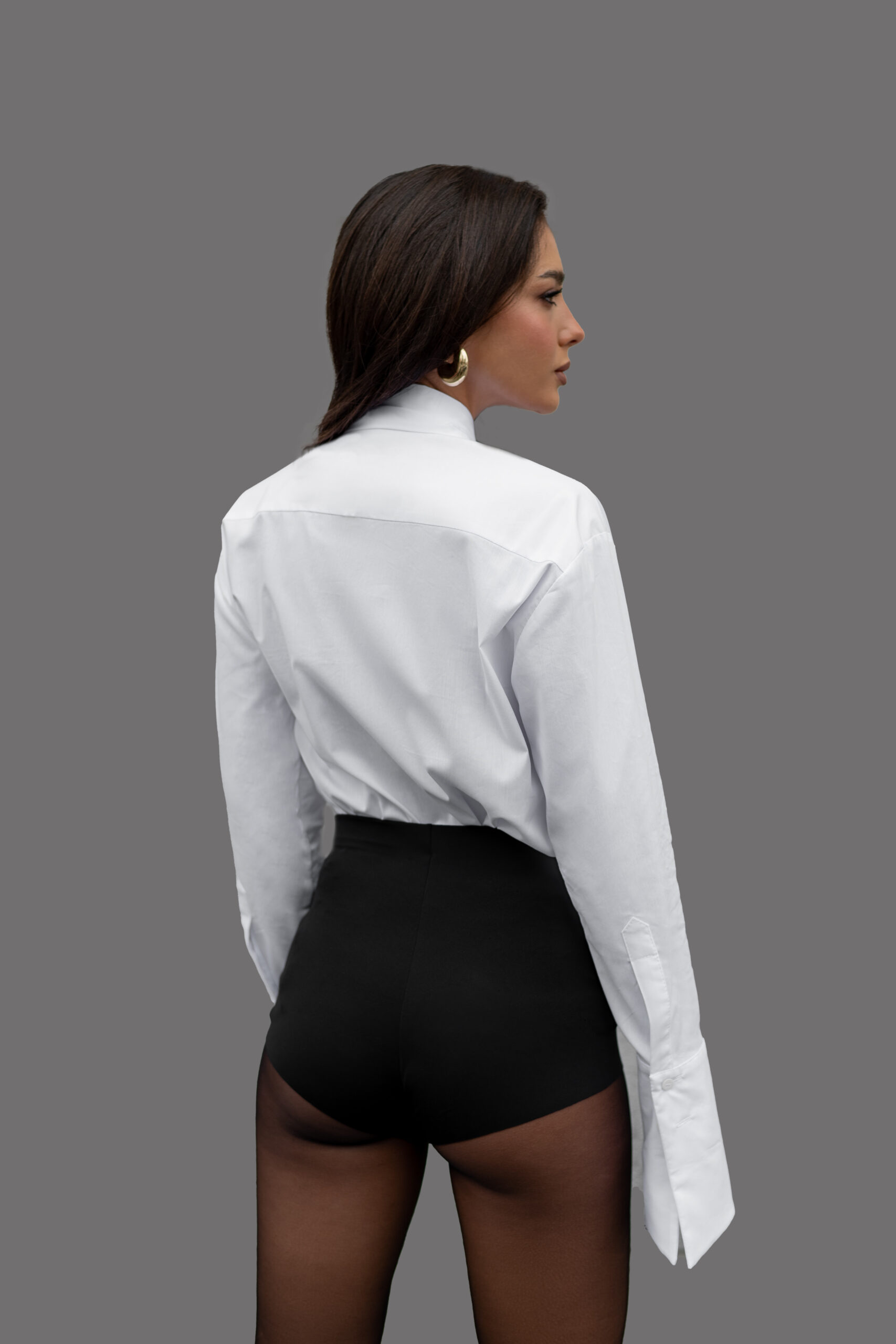 Koszula z szarfą w odcieniu zimnej bieli w oversize’owym kroju. Przedłużone mankiety zapinane na 2 guziki. Lekko wydłużony tył.