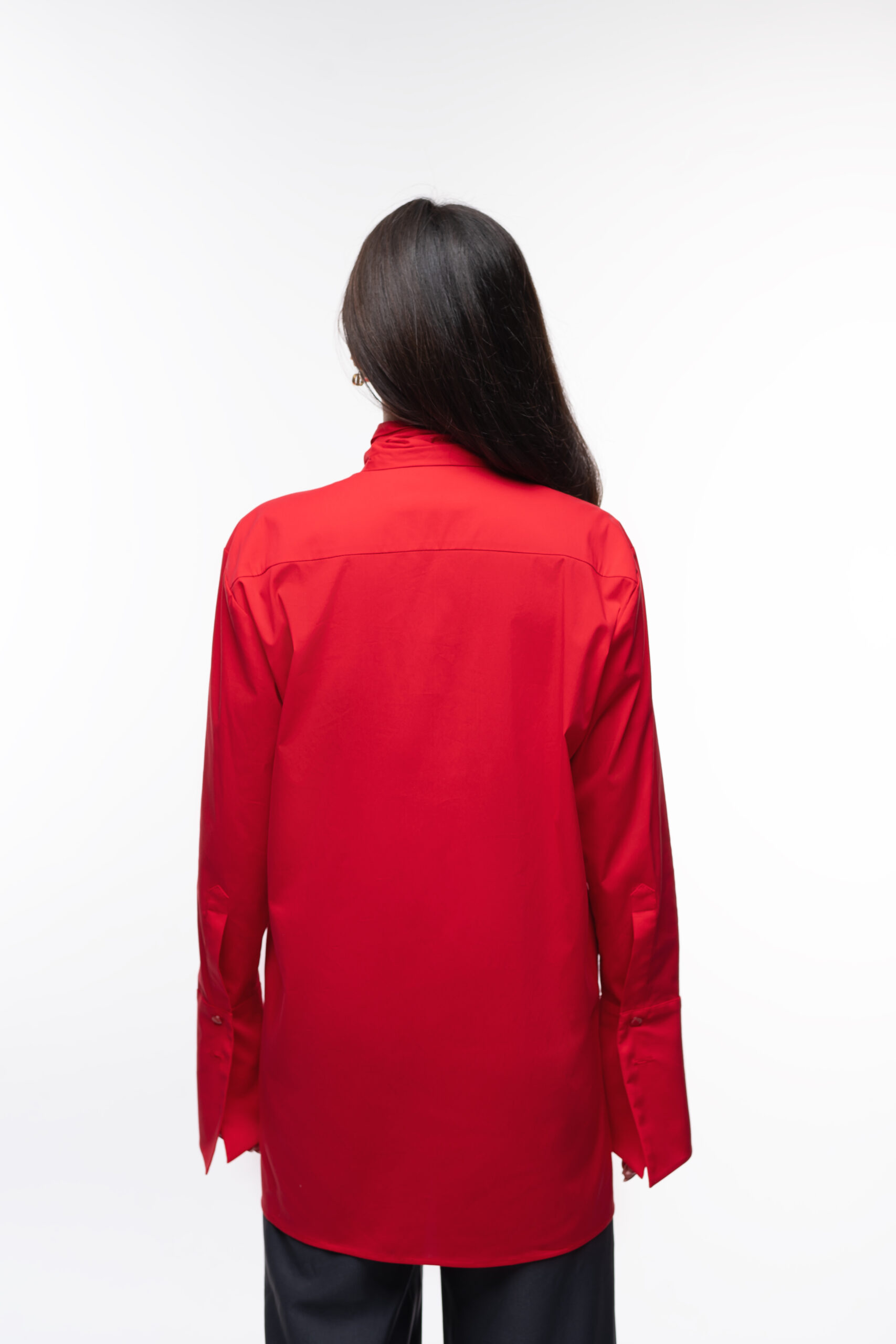 Czerwona koszula z szarfą w oversize’owym kroju. Przedłużone mankiety zapinane na 2 guziki. Lekko wydłużony tył.