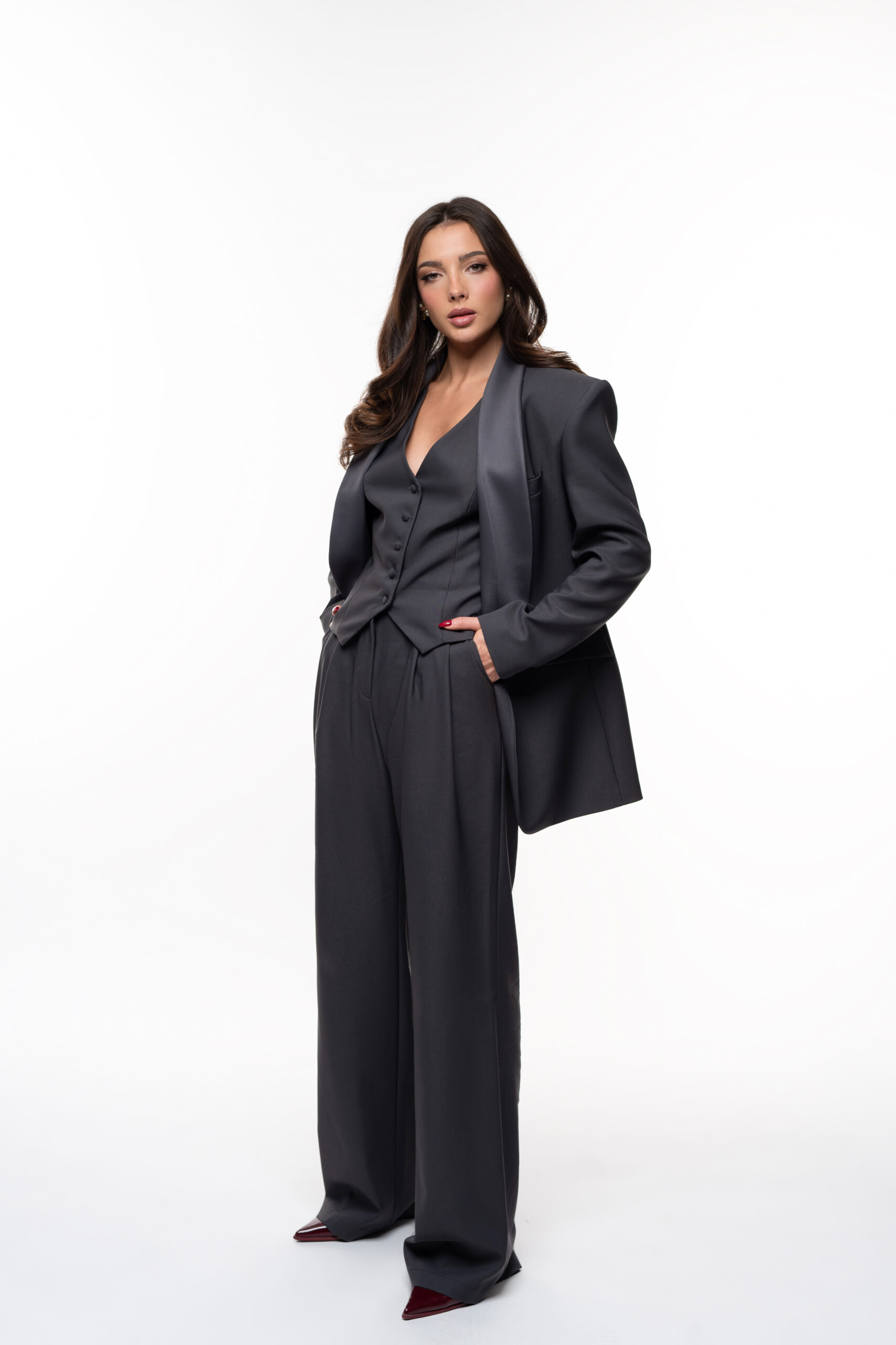 Ta wyjątkowa grafitowa marynarka z błyszczącymi, satynowymi klapami to kwintesencja klasycznej elegancji w nowoczesnym wydaniu. To model, który łączy siłę biznesowego looku z subtelnym, wieczorowym akcentem.