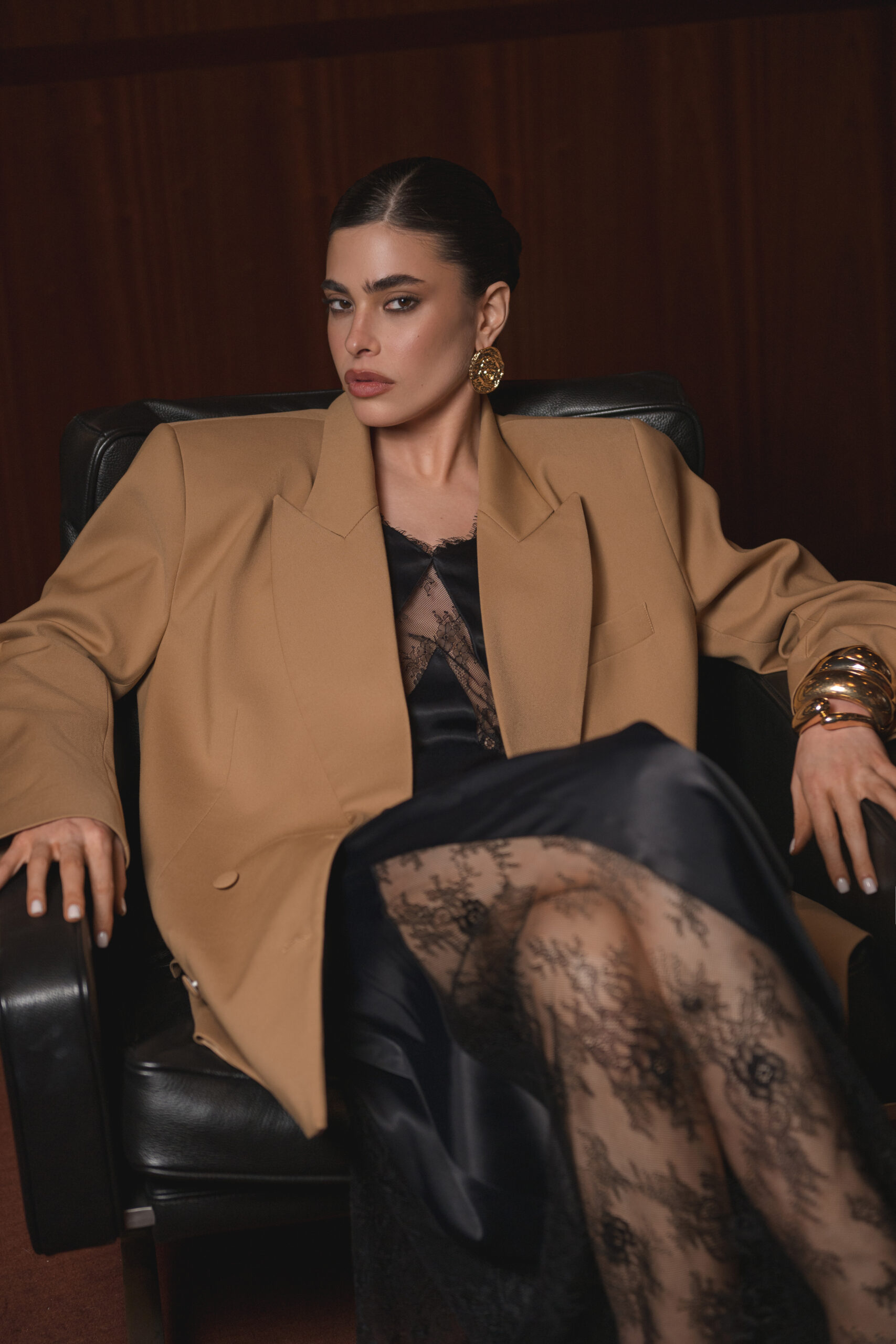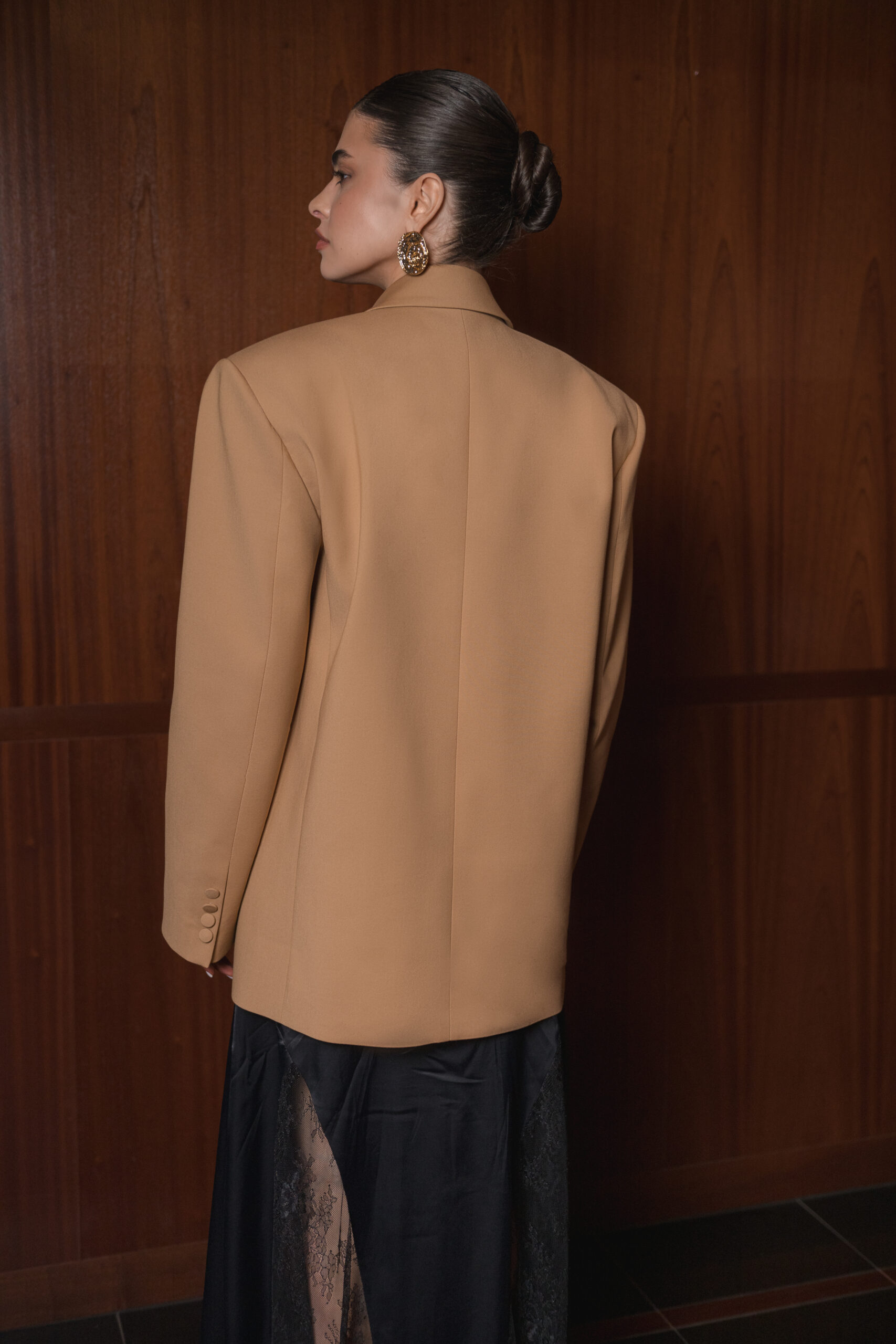 Klasyczna oversizowa marynarka Kate o pudełkowym kroju w kolorze carmelu. Z klasycznymi detalami, takimi jak szerokie ramiona, guziki. Marynarka tworzy szykowny i nowoczesny look.