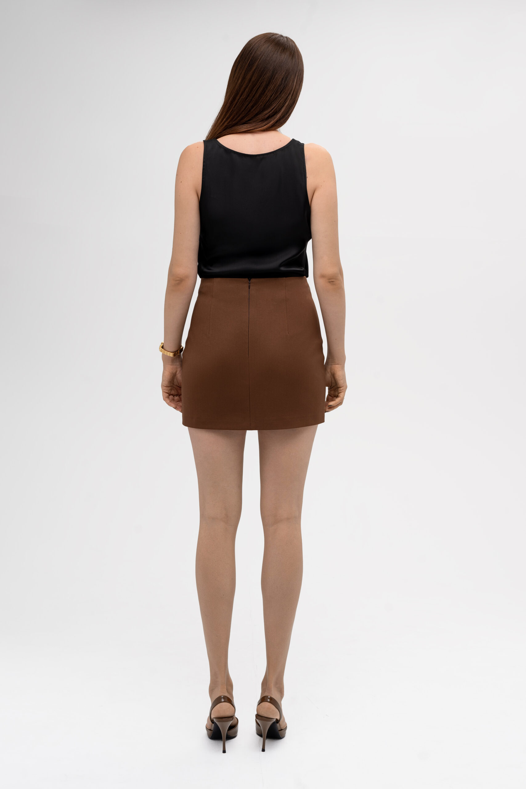 Mini spódnica w kolorze Mokka. Wykończona niskim stanem.