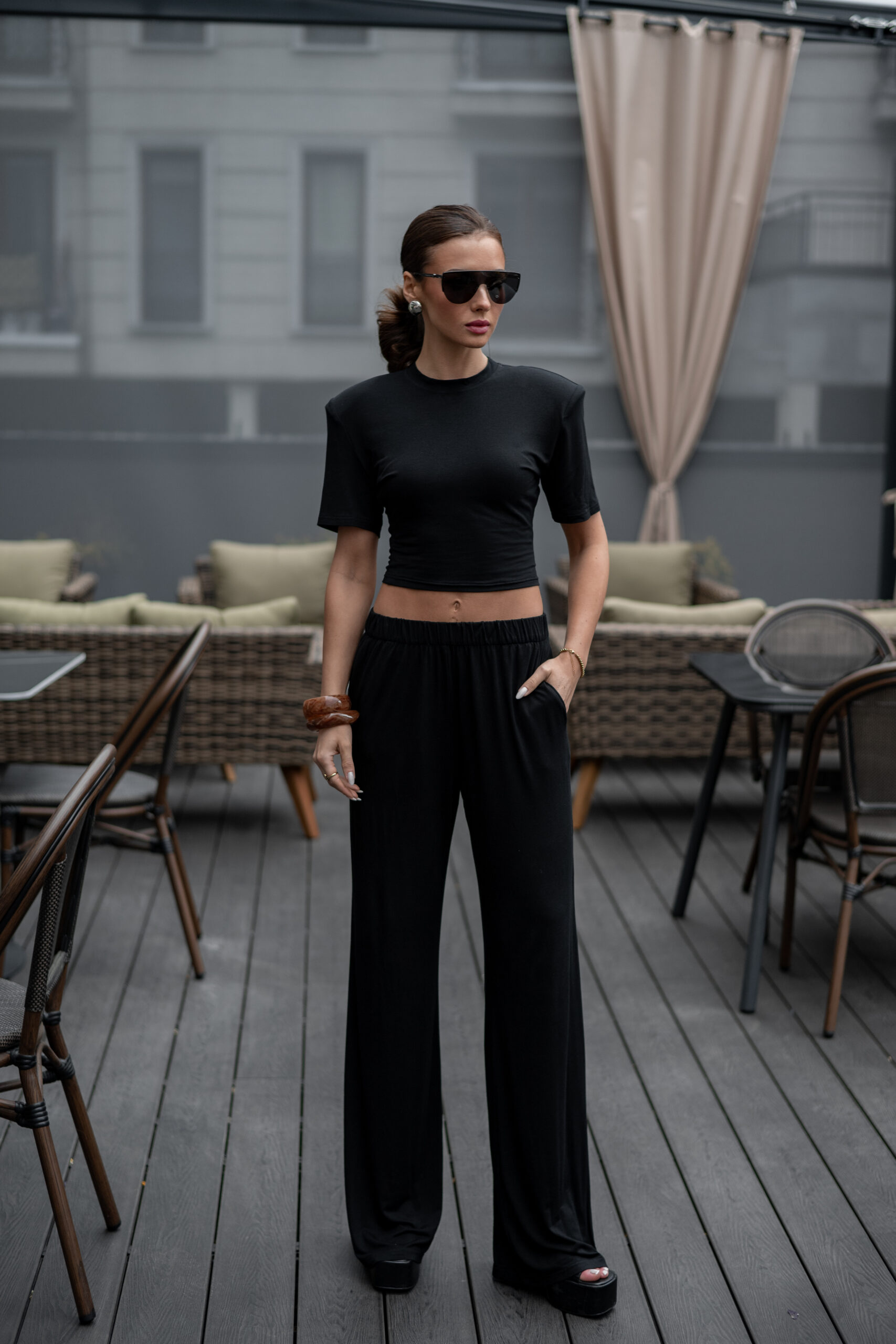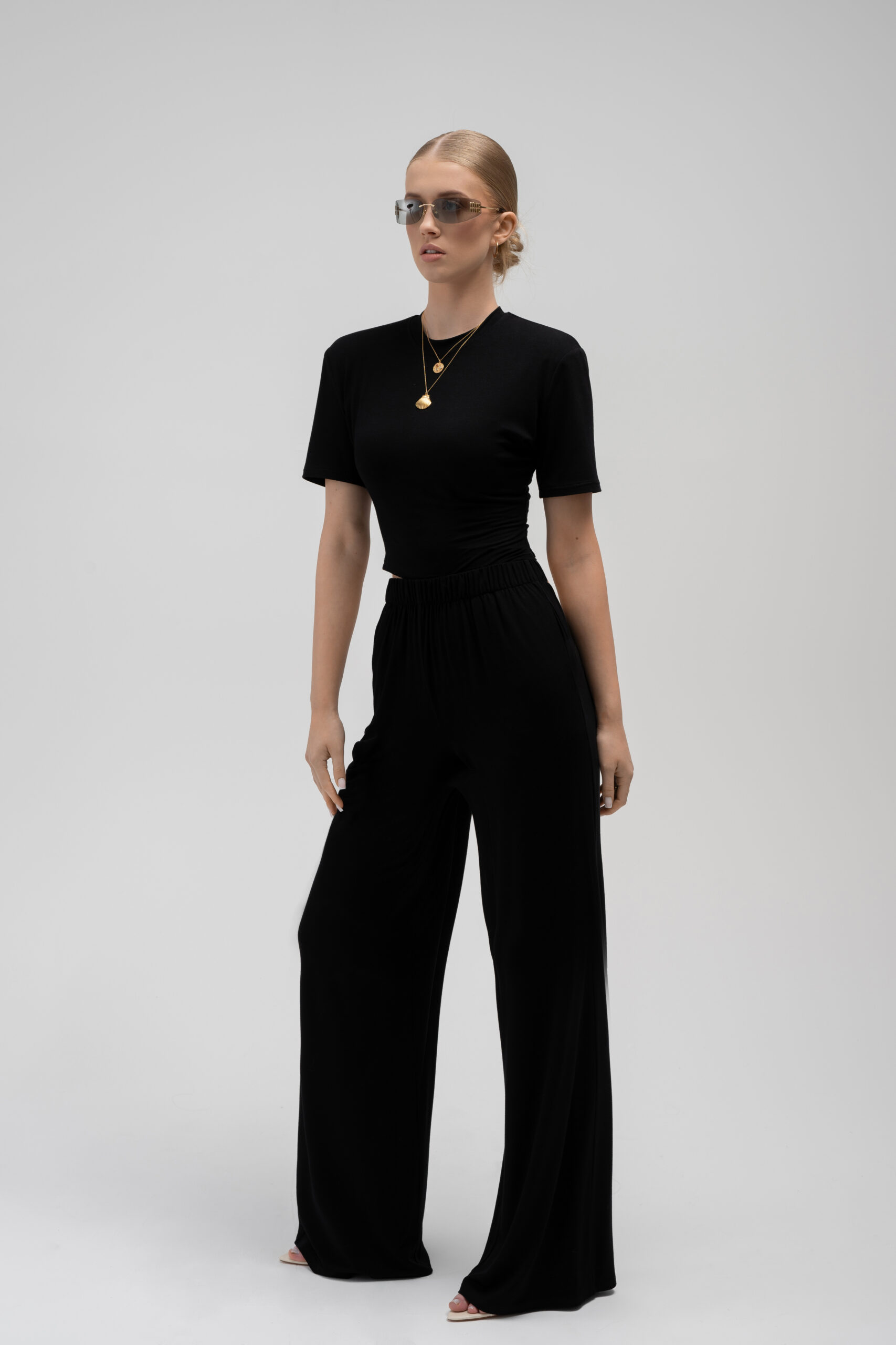Minimalistyczny T-shirt w kolorze czarnym z krótkim rękawem. Wykonany z elastycznego, dopasowującego się do sylwetki materiału bambusowego. Doskonały wybór na codzienne stylizacje – świetnie komponuje się ze spodniami z kolekcji bambusowej.