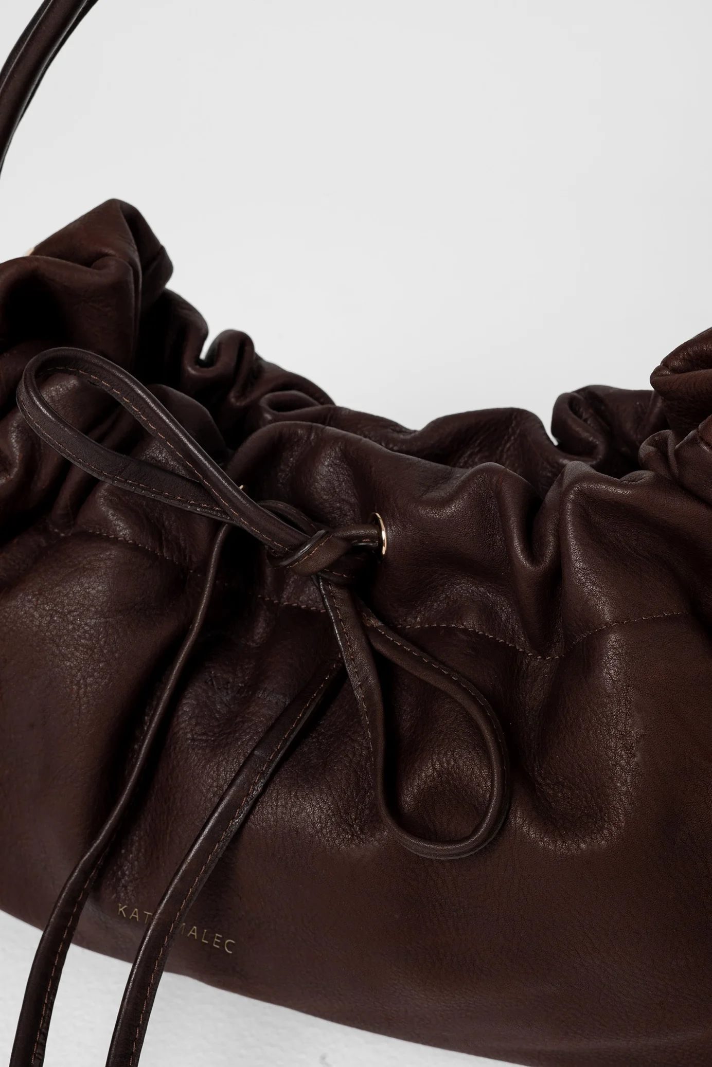 Model torebki charakteryzuje się mocnym marszczeniem pasek regulowany na dowolną wysokość. Zapinana wewnątrz na metalowy zatrzask oraz zawiązywana dwoma skórzanymi sznurkami. Złote dyskretne logo KATE MALEC. Idealna do noszenia niezbędnych drobiazgów, torba to kwintesencja ponadczasowej elegancji, która z łatwością będzie Ci towarzyszyć podczas miejskich spacerów. Kolor skóry na zdjęciu może różnić się kolorem w rzeczywistości. WYMIARY: Długość: 45 cm Wysokość: 23 cm Czas realizacji: 10 dni